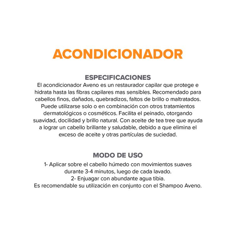 Acondicionador Aveno Capilar Protege Cuero Cabelludo 250 ml AVENO | ACONDIC. EM 250 ML INDICADO: Restaurador capilar de uso diario con avena, para cabellos finos y maltratados. ACCIÓN TERAPÉUTICA Acondicionador. Protector. Emoliente. Restaurador capilar para cabellos dañados con cuero cabelludo reac...