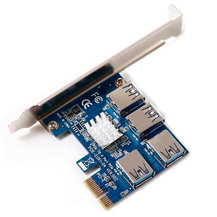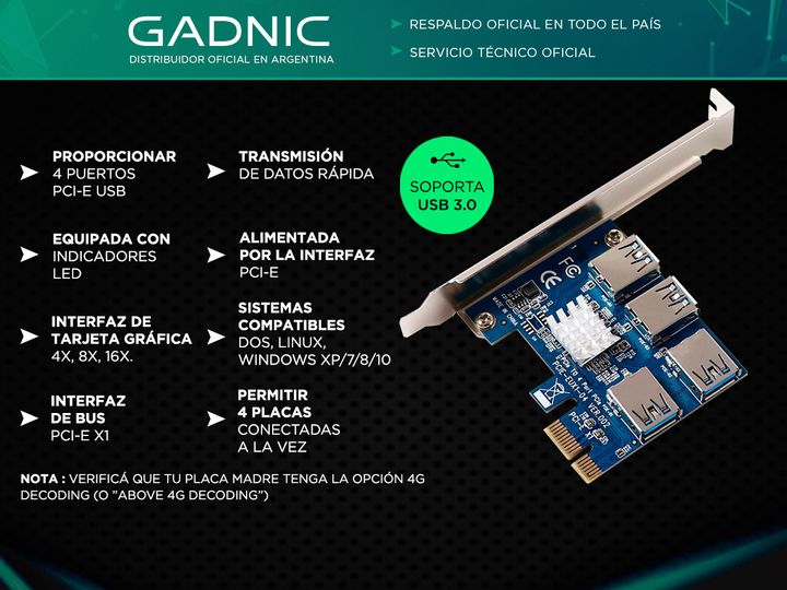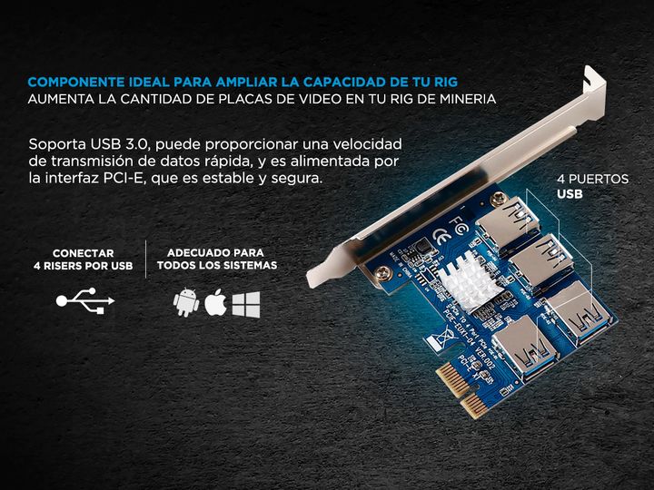 Este producto permite usar solo un puerto PCI-E de la placa madre para conectar 4 risers por USB. La tarjeta de expansión PCI-E a USB tiene interfaz de bus PCI-E X1, se puede conectar con interfaz de tarjeta gráfica 4x, 8x, 16x. Esta placa PCI-E de 4 puertos USB soporta USB 3.0, puede proporcionar u...