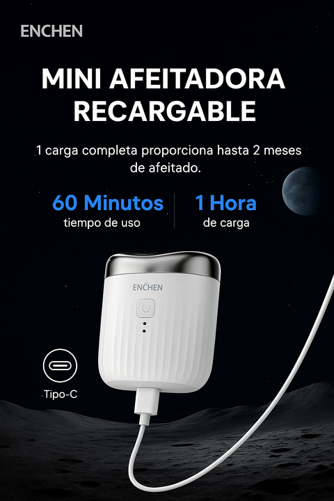 ENCHEN AFEITADORA SKU: MINI PRO - Entrada: 5 V/1 A - Batería: 400 mAh/3,7 V Li-ion - Tiempo de carga: 1 hora - Autonomía: 1 hora - Interfaz de carga: Tipo C - Resistente al agua - Cuchilla magnética - Bloqueo de viaje 12 MESES DE GARANTIA CON LA MARCA