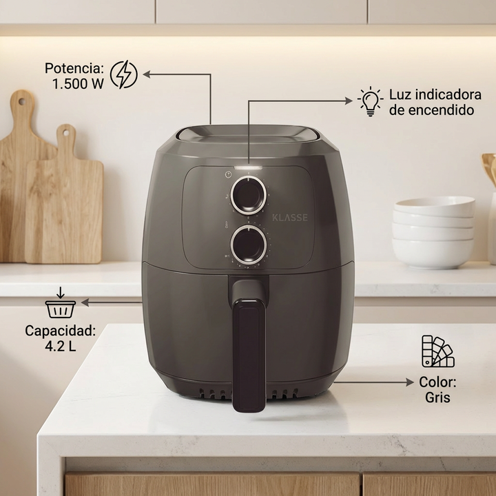 Potencia: 1.500W • Capacidad: 4.2 Lts • Regulador de temperatura • Temporizador • Luz indicadora de encendido • Superficie antiadherente • Color gris