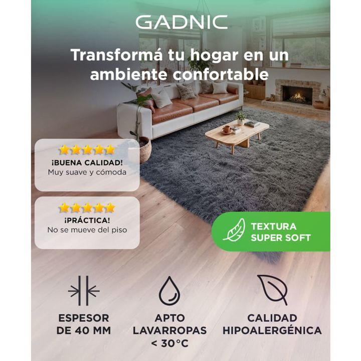 Textura super soft de alto confort: Superficie de poliéster aterciopelado con pelo largo tipo shaggy (38–40 mm). Brinda suavidad extrema y amortiguación en cada paso, ideal para living, dormitorio o cuartos infantiles. Base antideslizante de seguridad: Equipada con miles de puntos plásticos que aume...