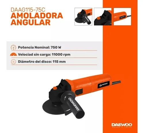 AMOLADORA 115MM 750W 11000RPM DAAG115-75 DAEWOO La amoladora Daewoo DAAG115-75 de 115 mm (4 ½) de diámetro, es la opción ideal para quien necesita una herramienta confiable y versátil. Su diseño ergonómico y equilibrio entresu peso y potencia es perfecto para realizar cualquier tarea gracias asu rob...