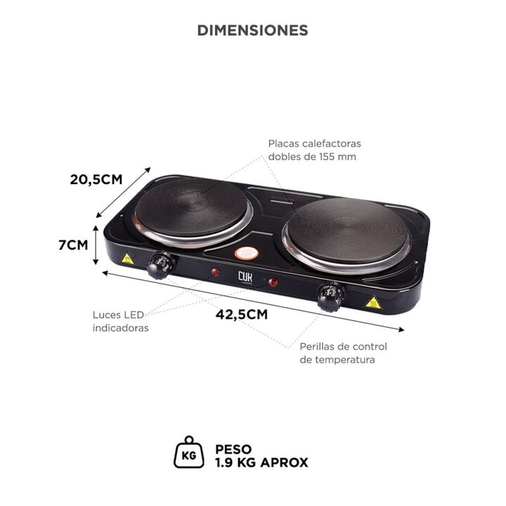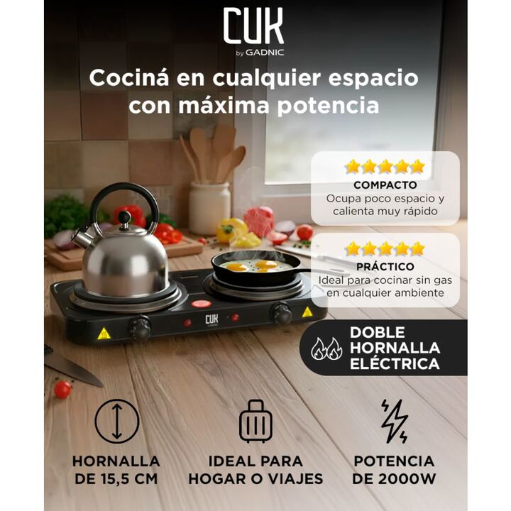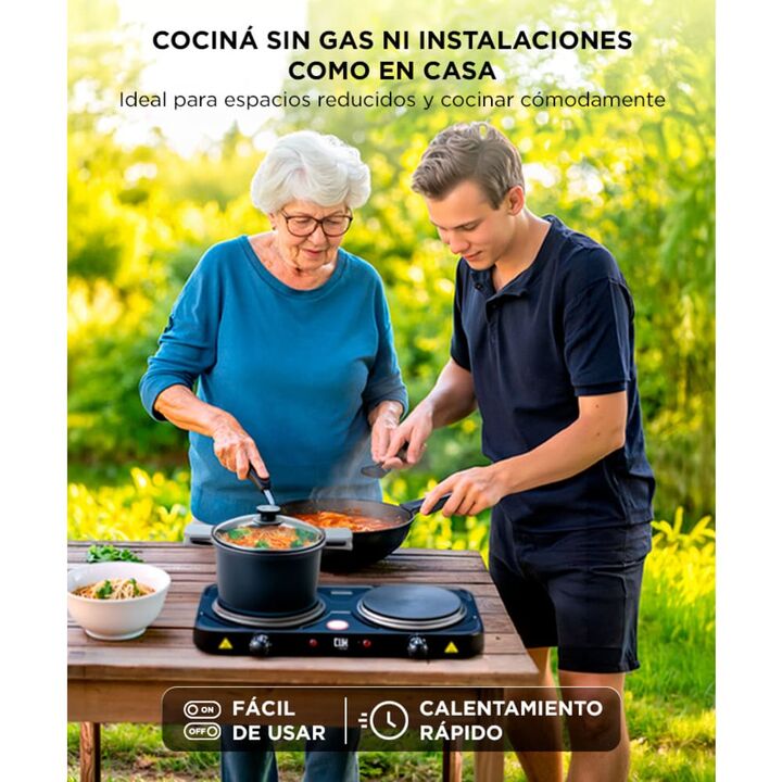 Cociná donde quieras: Solución eléctrica ideal para ambientes sin gas. Portátil, eficiente y lista para usar en cualquier lugar. Doble hornalla independiente: Permití cocinar dos platos a la vez con control individual de temperatura. Práctica para familias o tiempos cortos. Potencia total de 2000W: ...