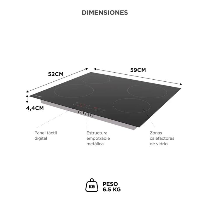 Máxima potencia para cocinar sin demoras: El anafe vitrocerámico Maverick de 60 cm ofrece una potencia total de 6000W distribuida en cuatro hornallas, permitiendo preparar múltiples recetas al mismo tiempo con un calentamiento rápido y eficiente. Cuatro zonas de cocción para mayor versatilidad: Sus ...
