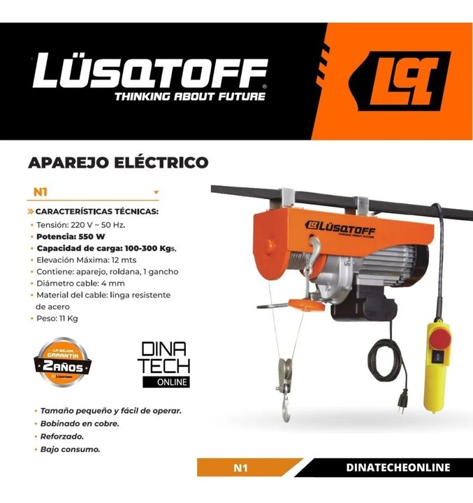 Aparejo Electrico Lusqtoff N1 550W capacidad 150/300kg 12m LUSQTOFF N1 El N1 es un sistema de aparejo eléctrico que hace que la elevación y el descenso de su equipo sea más fácil que nunca. Esta unidad incluye un cordón de acero, un motor con bobinado de cobre y una fuente de alimentación de 550 Kw....