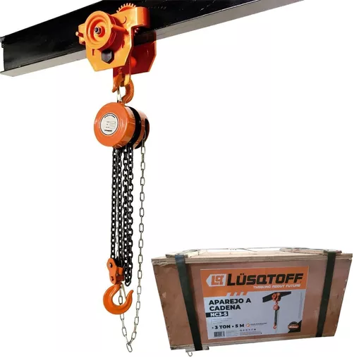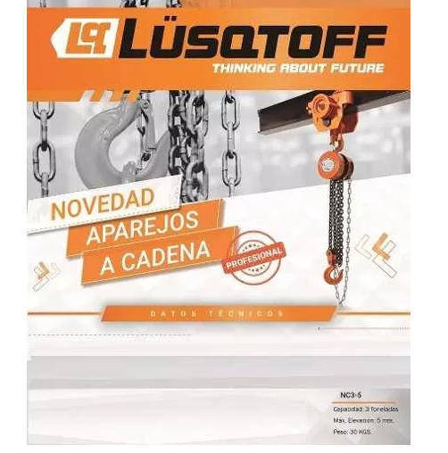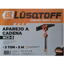 APAREJO MANUAL LÜSQTOFF NC3-5 3 TONELADAS CADENA 5M ELEVACIÓN El aparejo a cadena Lusqtoff modelo NC3-5 es una herramienta robusta y eficiente para elevación con las siguientes características destacadas: Capacidad: Puede levantar hasta 3 toneladas, adecuado para una variedad de aplicaciones industr...