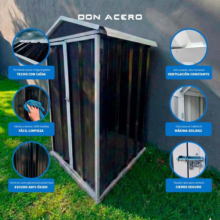 Don Acero presenta este depósito de alta calidad, fabricado en acero galvanizado prepintado, ideal para almacenar herramientas, bicicletas, equipos de jardinería y otros objetos de uso diario. Con una vida útil garantizada de entre 8 y 10 años, libre de mantenimiento.