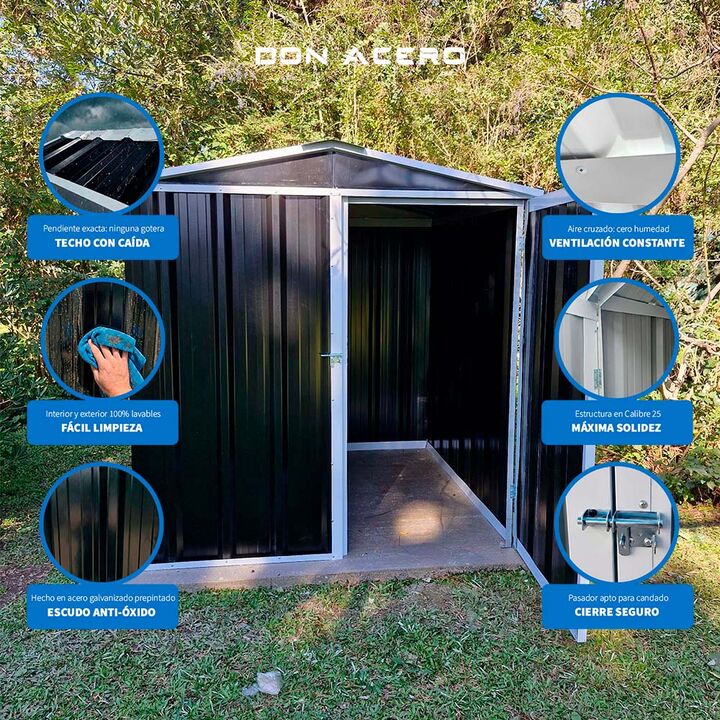 Don Acero presenta este depósito de alta calidad, fabricado en acero galvanizado prepintado, ideal para almacenar herramientas, bicicletas, equipos de jardinería y otros objetos de uso diario. Con una vida útil garantizada de entre 8 y 10 años, libre de mantenimiento.