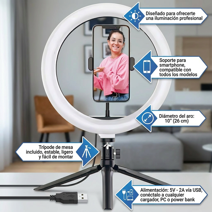 Aro de luz LED de 10 pulgadas con trípode • 3 tipos de luz: fría, cálida y neutra • Brillo regulable: 10 Niveles • Medidas: 26x39CM • Modo de alimentación: 5V-2A