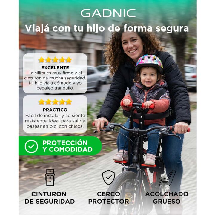 Seguridad pensada para el traslado infantil La sillita infantil para bicicleta Gadnic incorpora cinturón de seguridad y cerco protector, brindando mayor contención durante paseos urbanos o recreativos. Estructura resistente para uso confiable Fabricada en PE combinado con acero de alto carbono, ofre...