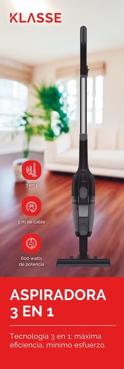 La aspiradora 3 en 1 Klasse permite limpiar pisos, rincones y superficies con una solución práctica y compacta para el hogar.