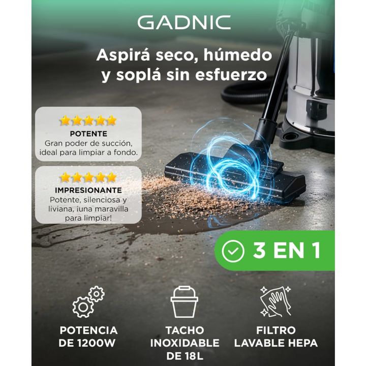 La Aspiradora Industrial Profesional de Alta Potencia Gadnic de 1200W, está diseñada para satisfacer las necesidades más exigentes de limpieza en el hogar, la oficina, habitaciones y hoteles. Fabricada con un robusto cubo de acero inoxidable y equipada con un potente motor V2Z-S24-L de 220V-1200W-50...