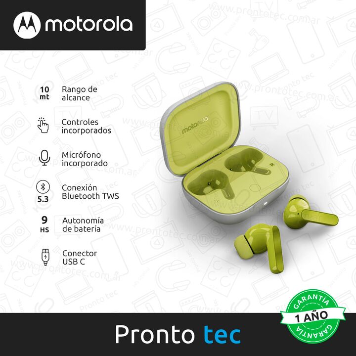 CARACTERÍSTICAS: - Marca: Motorola - Modelo: Buds Guitar - Tipo de conexión: Inalámbrica - Tipo de auriculares: In-Ear - Bluetooth: 5.3 - Distancia de conexión: 10 Mt - Resistente al agua: Si - Compatible con asistente de control de voz: Siri, Google assistant - Tiempo de carga: 90 min - Duración ba...