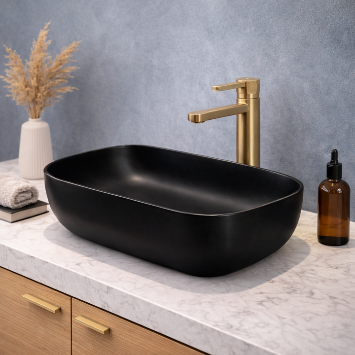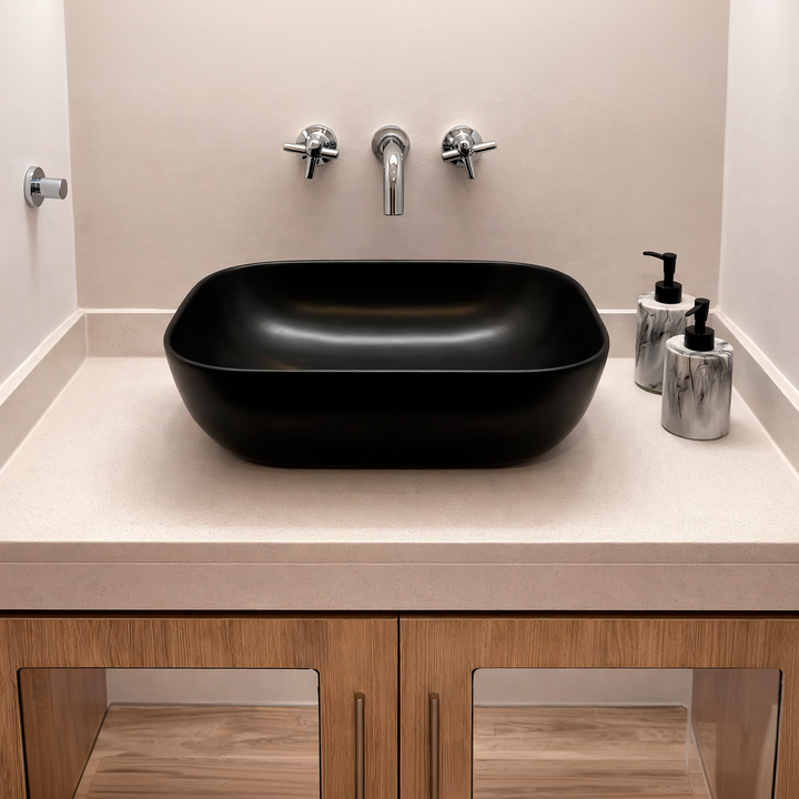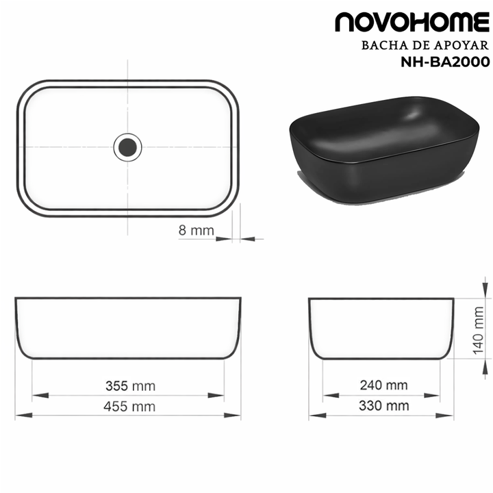 NOVOHOME BACHA DE APOYO SLIM RECTANGULAR NEGRA SKU: NH-BA2000NG Sumá diseño y funcionalidad a tu baño con esta bacha de apoyar Novohome, ideal para espacios modernos y elegantes. Su formato compacto y líneas suaves aportan una estética minimalista, convirtiéndola en una excelente opción tanto para b...