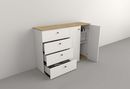 Medidas: Largo 1,29 m - Alto 0,90 m - Profundidad 0,38 m Cantidad de puertas: 2 Cantidad de estantes:1 Cantidad de cajones: 4 Tiradores Metálicos color Cobre Envejecido Sistema Minifix Bisagras metálicas Melamina de Alta Resistencia IMPORTANTE Los muebles salen embalados en caja con instructivo de a...