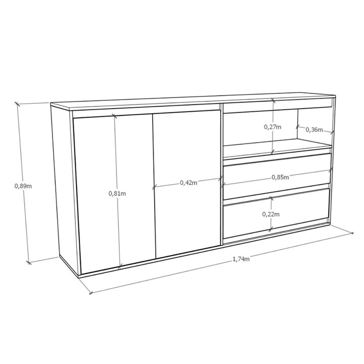 Melamina de alta resistencia: Garantiza durabilidad y fácil mantenimiento. 2 Cajones con correderas metálicas. 2 Puertas con bisagras metálicas. Sistema Minifix. Interiores totalmente revestidos. Incluye instructivo de armado. Medidas: Ancho: 1.745 mts. Alto: 0.89 mts. Profundidad: 0.36 mts. Product...