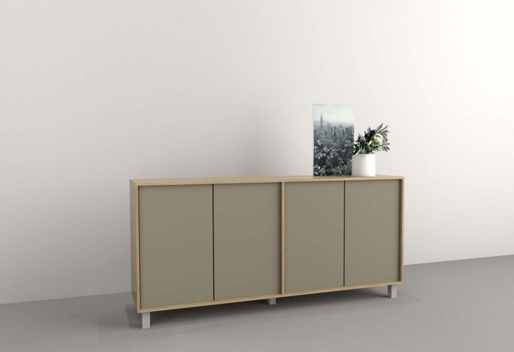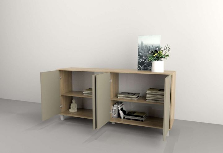Medidas: Largo 1,80 m - Alto 0,77 m - Profundidad 0,36 m Cantidad de puertas: 4 Cantidad de estantes: 2 Sistema push en puertas Peso: 37 Kg. Sistema Minifix Bisagras metálicas Patas plasticas con Laca UV Melamina de Alta Resistencia IMPORTANTE Los muebles salen embalados en caja con instructivo de a...