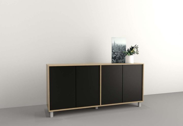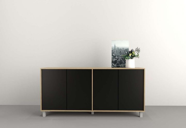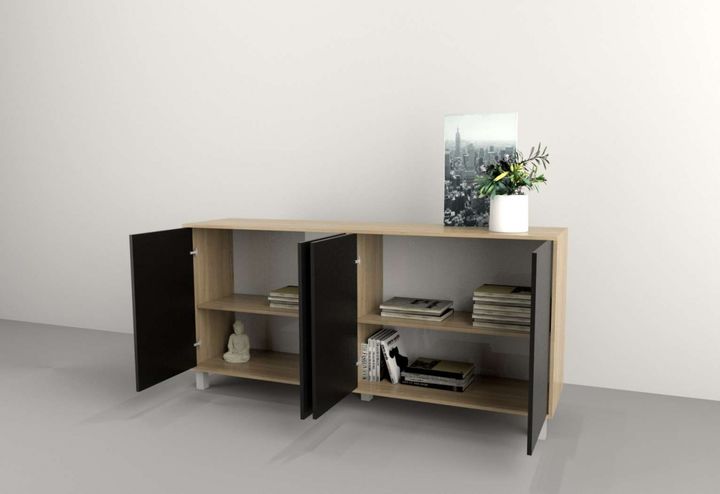 Medidas: Largo 1,80 m - Alto 0,77 m - Profundidad 0,36 m Cantidad de puertas: 4 Cantidad de estantes: 2 Sistema push en puertas Peso: 37 Kg. Sistema Minifix Bisagras metálicas Patas plasticas con Laca UV Melamina de Alta Resistencia IMPORTANTE Los muebles salen embalados en caja con instructivo de a...