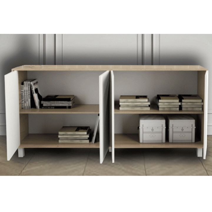 Bahiut de melamina de alta resistencia Línea Minimal. Cuatro puertas con sistema de apertura de puertas push y bisagras metálicas. Dos estantes interiores. Sistema minifix. Patas plásticas con Laca UV. Color Finlandes y Everest Medidas: Ancho: 1.80 mts. Alto: 0.77 mts. Profundidad: 0.36 mts Requiere...