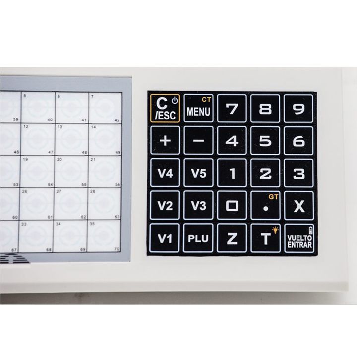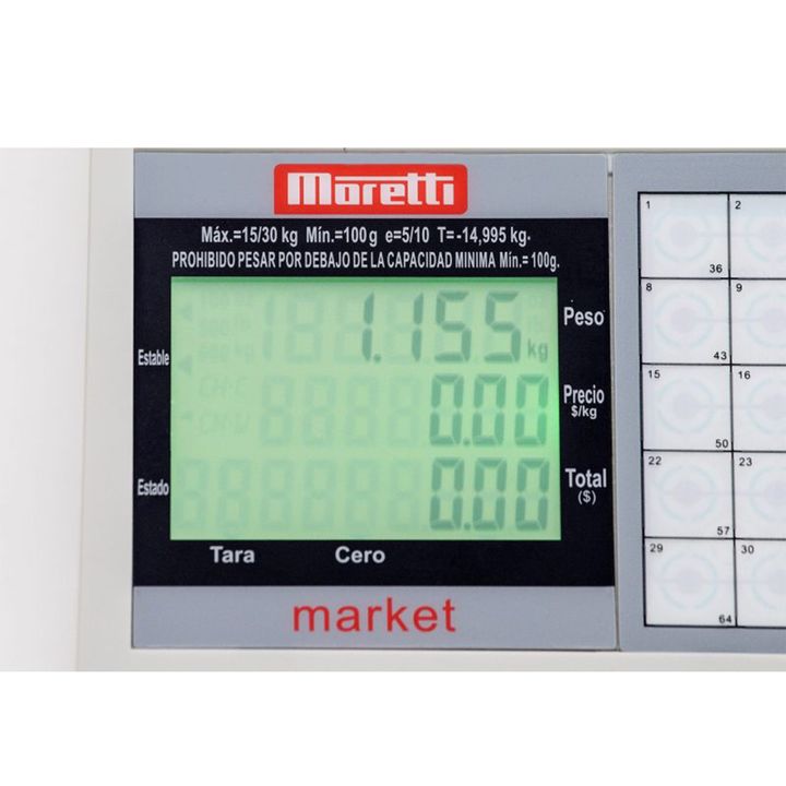 BALANZA COMERCIAL DE MOSTRADOR MORETTI MARKET Alimentación a pilas, única en el mercado! – 70 PLU de capacidad, todos con teclas directas. – 5 vendedores / suma de partidas. – Conexión a PC e impresor de tickets.