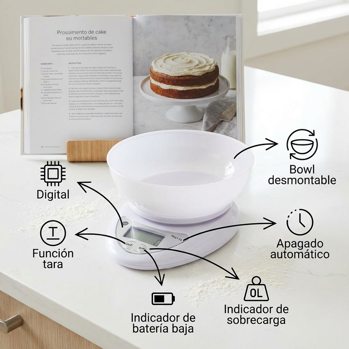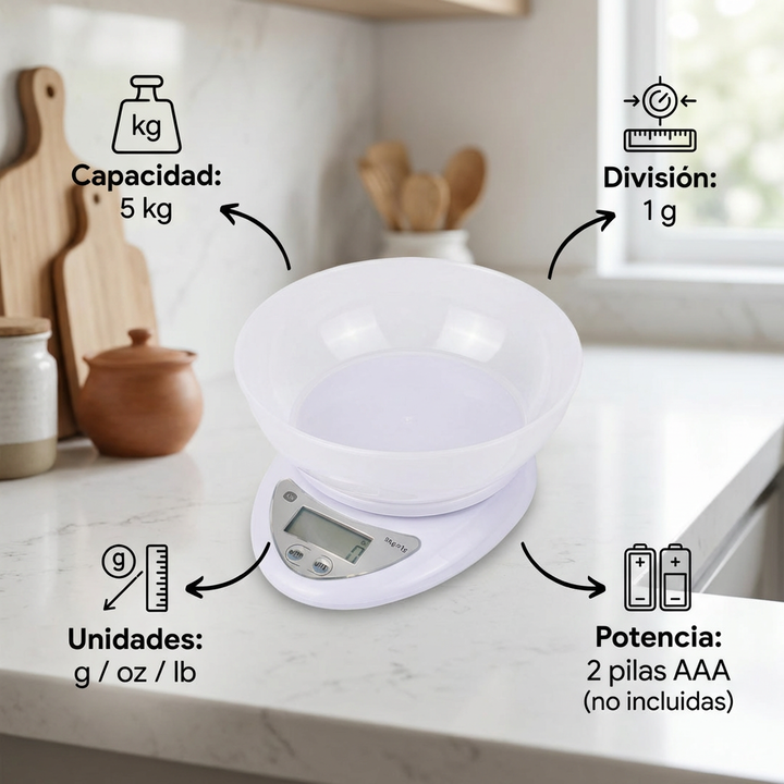 Capacidad: 5kg • División: 1g • Unidades: g/oz/lb • Función tara • Apagado automático • Potencia: 2 pilas AAA ( no incluidas) • Indicador de batería baja y sobrecarga.