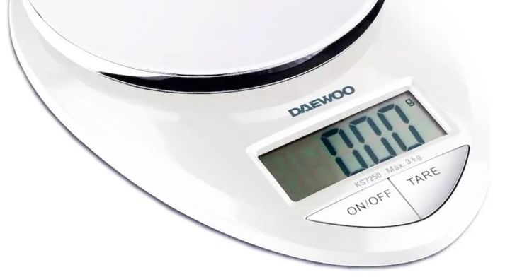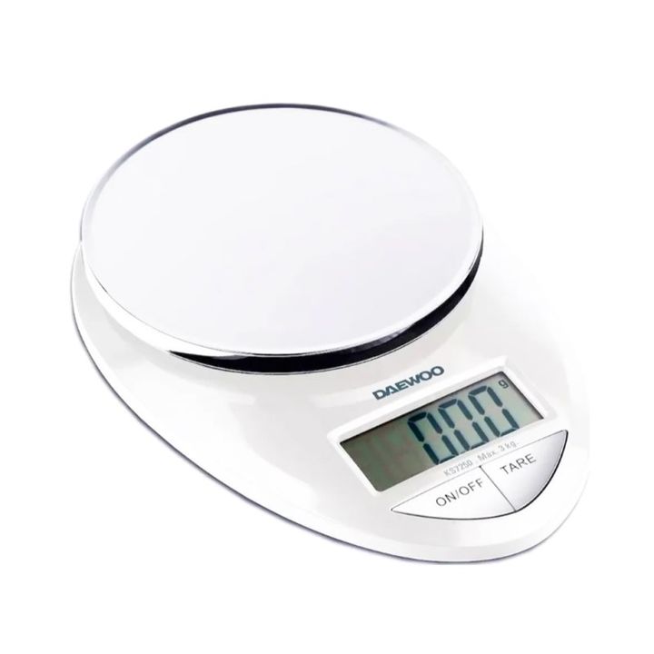 BALANZA DE COCINA DIGITAL KS7250 DAEWOO - DISEÑO MODERNO - CAPACIDAD HASTA 3 kg - Medidas:21,5cm x 15cm x 3,5cm - Peso 0,25kg - GRADUACI_N 1 g - FUNCI_N TARA QUE PERMITE AGREGAR ALIMENTOS Y VOLVER A 0 SIN SACARLOS - APAGADO AUTOM¦TICO - INDICADOR DE SOBREPESO - INDICADOR DE BATER+A BAJA- MODELO KS72...