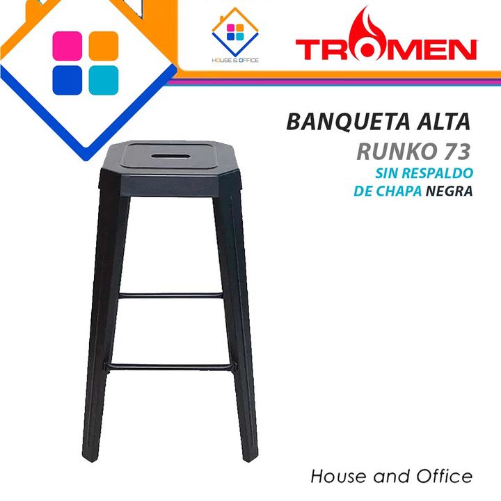 BANQUETA ALTA RUNKO 73 TROMEN X2 CHAPA NEGRA SIN RESPALDO Marca:Tromen Código: 73X2NEGRO ESTILO + FUNCIÓN + COMODIDAD Disfrutalas en galerias, quinchos y espacio semicubiertos como patios, terrazas, balcones y jardines ERGONÓMICAS + RESISTENTES Ideal para locales gastronómicos y comerciales 2 UNIDAD...