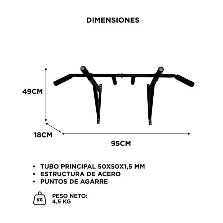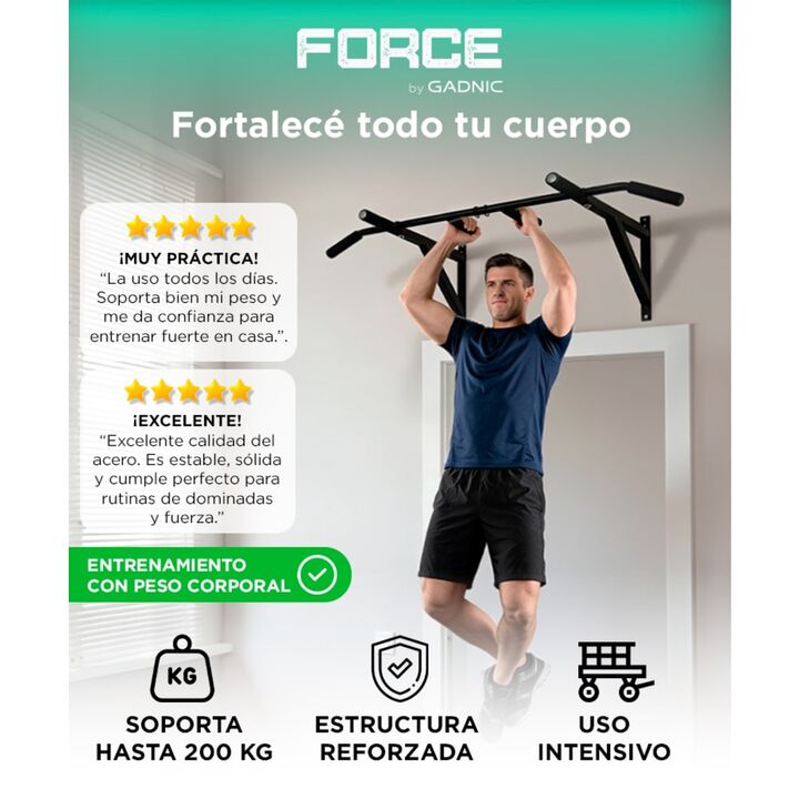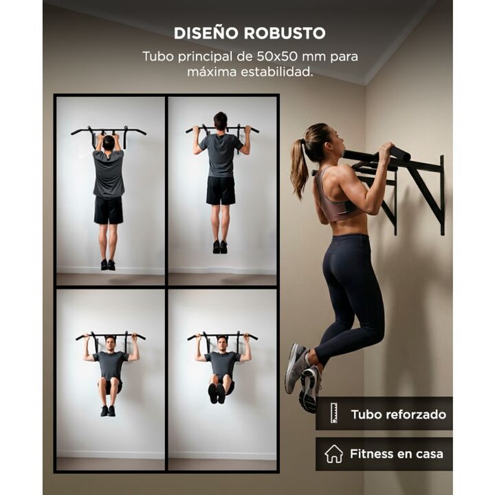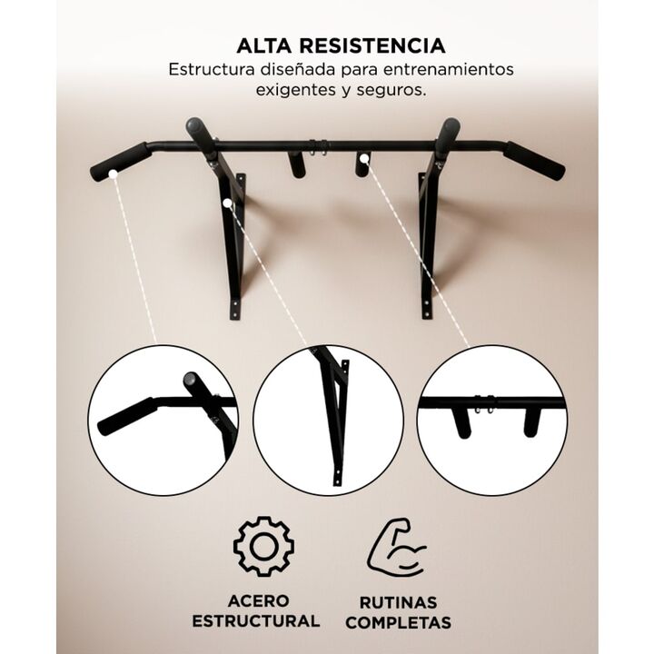 Entrenamiento completo con peso corporal: La barra de dominadas FITNES704 permite trabajar espalda, brazos, hombros y core utilizando el propio peso. Es una opción práctica para rutinas de fuerza y resistencia en casa. Estructura reforzada para uso exigente: Fabricada con tubo principal de acero de ...