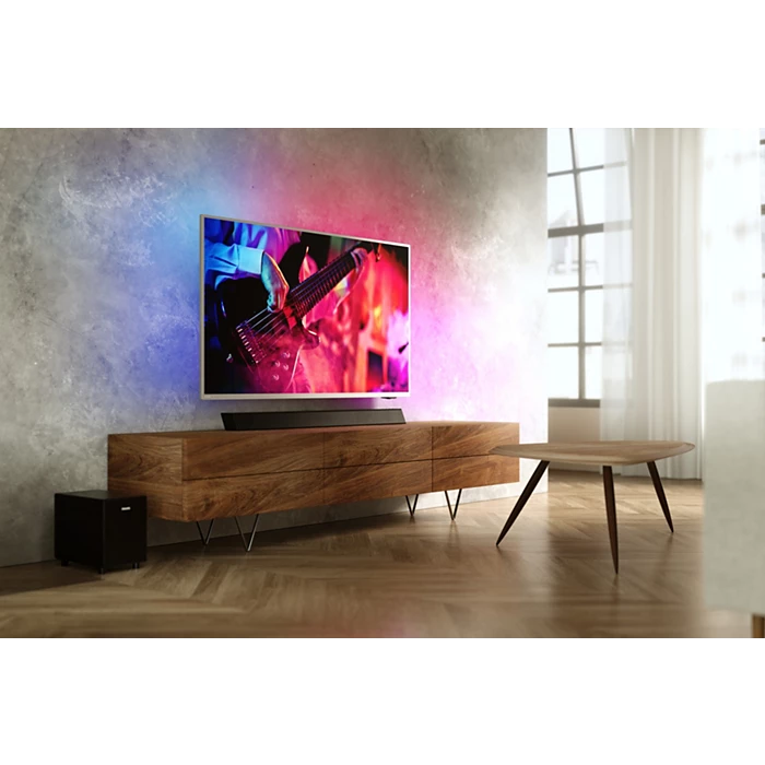 Escuche más. Fascínese más. Esta barra de sonido y los subwoofer inalámbricos llevan el audio del televisor al siguiente nivel, lo que proporciona un sonido más nítido y graves más profundos. Con Bluetooth, entrada de audio y entradas ópticas, también puede liberar su música. El sonido del láser. El...