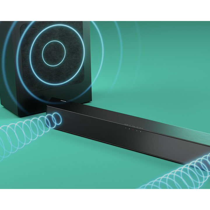 Esta fantástica barra de sonido de 2,1 canales con subwoofer con conexión inalámbrica lleva el auténtico sonido del cine a tu salón. Dolby Digital Plus ofrece un sonido Surround excelente y dos tweeters adicionales te permiten ampliar el entorno acústico aún más. Esta barra de sonido de 2,1 canales ...