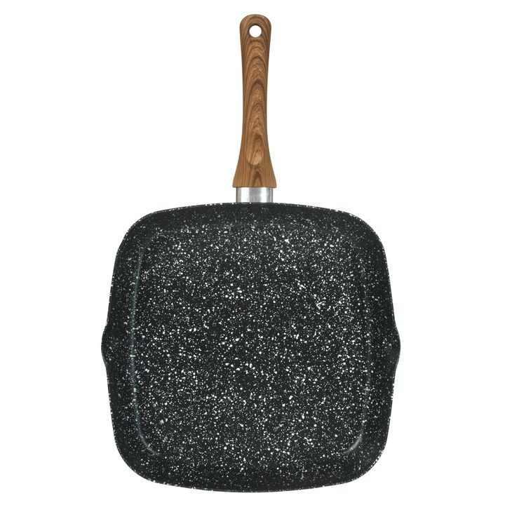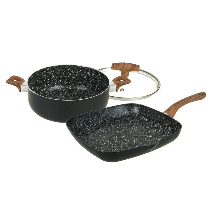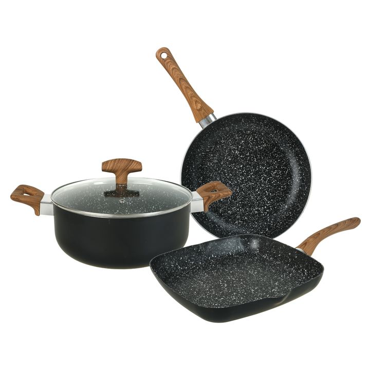 Bateria linea ETHNO , con antiadherente ceramica en su interior. Material : Aluminio con antiadherente ceramico en su interior. El mango es de baquelita simil madera , tacto soft touch siliconado . El interior tiene antiadherente ceramico ( pintitas blancas) , el exterior es liso. Compuesto por : 1-...