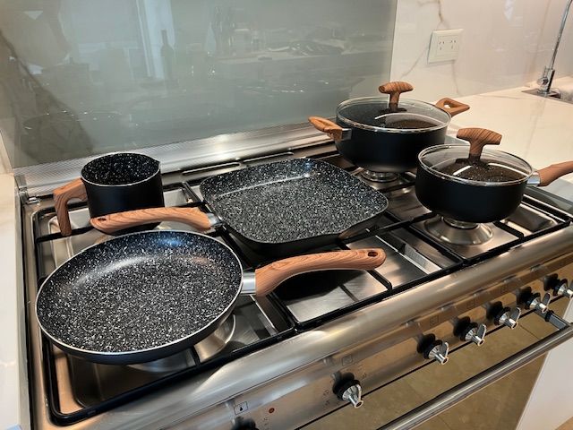 Bateria linea ETHNO , con antiadherente ceramica en su interior. Material : Aluminio con antiadherente ceramico en su interior. El mango es de baquelita simil madera , tacto soft touch siliconado . El interior tiene antiadherente ceramico ( pintitas blancas) , el exterior es liso. Compuesto por : 1-...