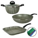 Batería Aston Terra Premium compuesta por : Material : Aluminio con antiadherente de 1,8 mm de espesor con mangos Baquelita negra Cacerola 20 cm con tapa de vidrio templado con orificio para salida de vapor, 1,8 mm de espesor. Altura de olla : 10.5 cms / Capacidad : 2,8 lts. Wok de 28 cm antiadheren...