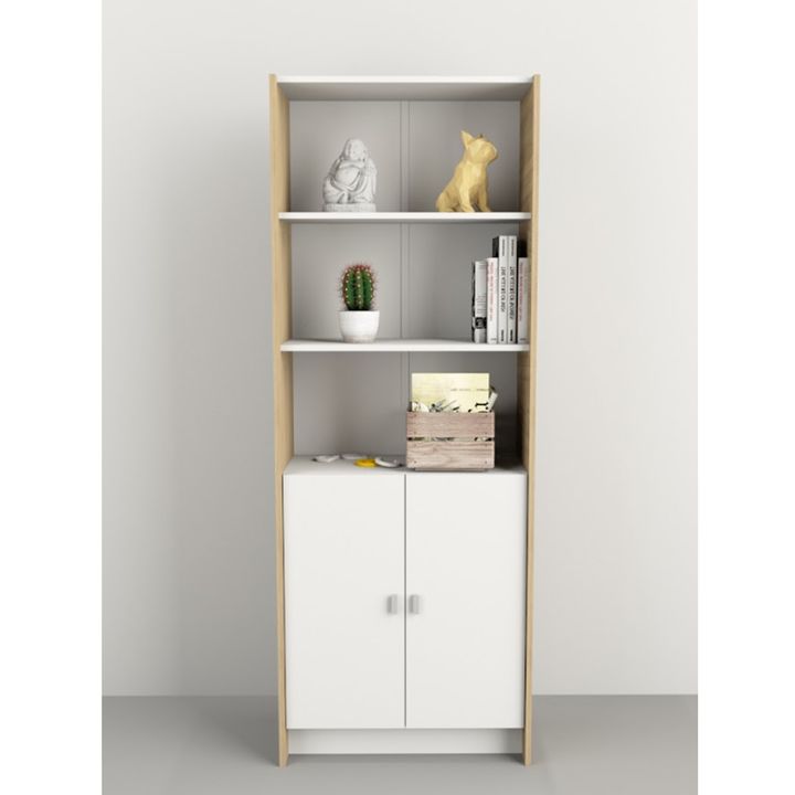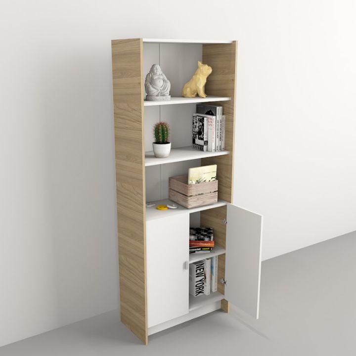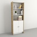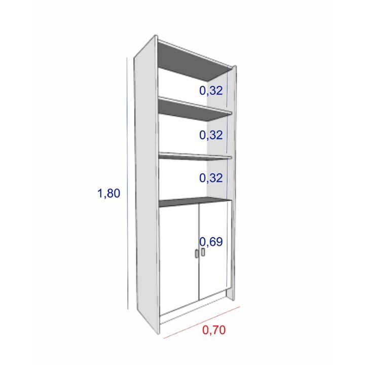 Biblioteca juvenil de melamina de alta resistencia. Dos puertas con bisagras metálicas. Dos estantes exteriores y uno interior. Tiradores metálicos. Sistema Minifix. Color Olmo Finlandés y Everest. Medidas: Alto: 1.80 mts. Ancho: 0.70 mts. Profundidad: 0.34 mts.
