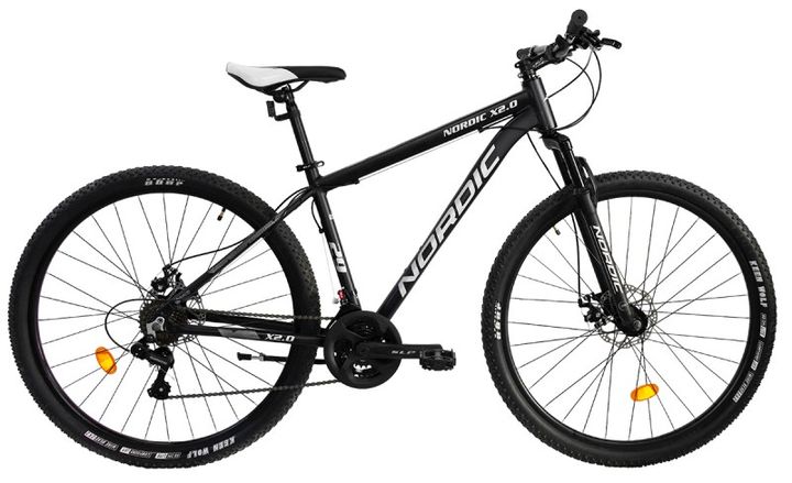 BICICLETA MTB X 2.0 RODADO 29 TALLE 20 16293 NEGRO BLANCO NORDIC -Rodado 29 -Talle 20 -Cuadro aluminio NORDIC -Calco bajo barniz -Freno a disco mecánico SLP -Piñón 7 coronas a rosca INDEX -Palanca SLP triple acero -Manija cambio + freno SLP 3 x 7 velocidades -Cambio SHIMANO TZ-31 Tourney 7 velocidad...