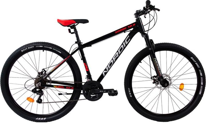 BICICLETA MTB X 2.0 RODADO 29 TALLE 20 16293 NEGRO NARANJA NORDIC -Rodado 29 -Talle 20 -Cuadro aluminio NORDIC -Calco bajo barniz -Freno a disco mecánico SLP -Piñón 7 coronas a rosca INDEX -Palanca SLP triple acero -Manija cambio + freno SLP 3 x 7 velocidades -Cambio SHIMANO TZ-31 Tourney 7 velocida...