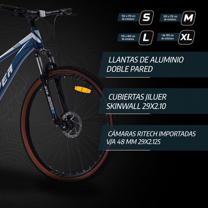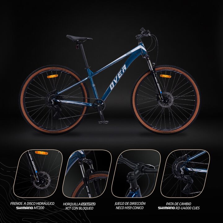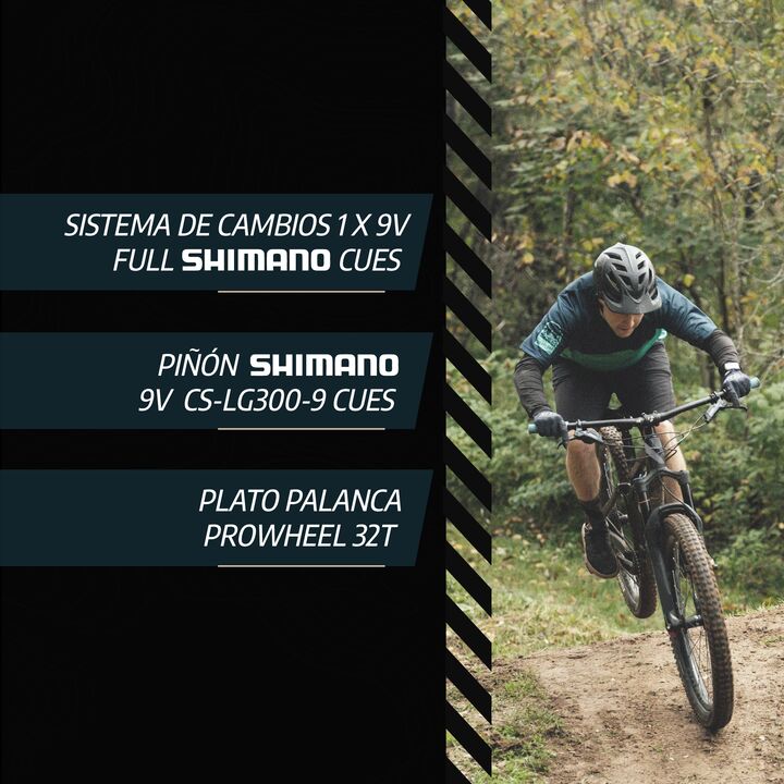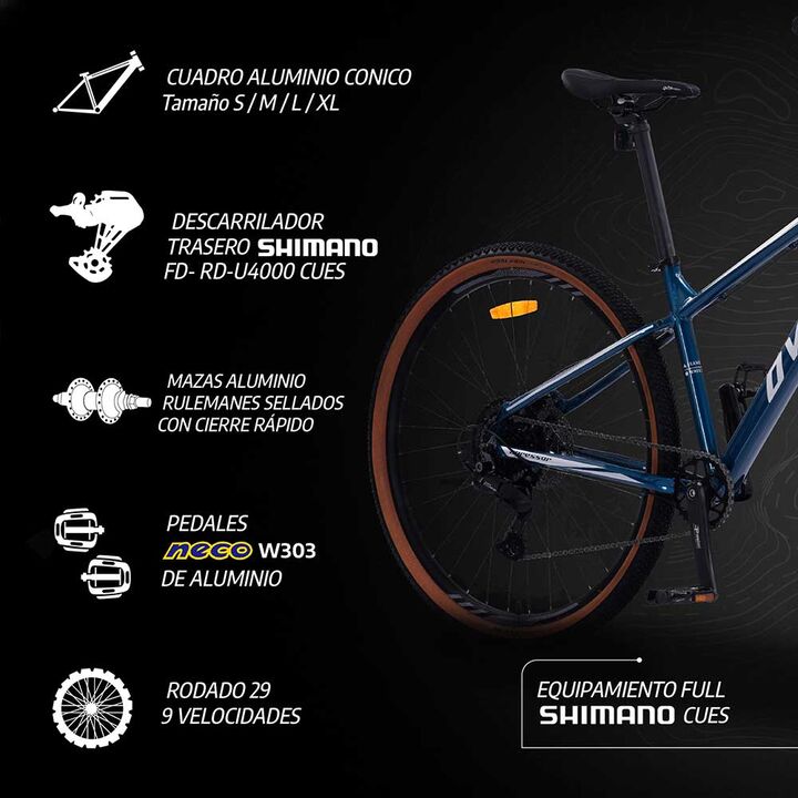 FRAME/CUADRO: ALUMINIO FRENTE CÓNICO FORK/HORQUILLAS: SUNTOUR XCT CON BLOQUEO HUB/ MAZAS: ALUMINIO RULEMANES SELLADOS CON CIERRE RÁPIDO HEAD PARTS/ JUEGO DE DIRECCIÓN: NECO H159 CÓNICO FREEWHEEL/PIÑÓN: Shimano CS-LG300-9 CUES, 9 velocidades HANLDEBAR/MANUBRIO: ZOOM MTB PO1FOV ALUMINIO STEM / FORMA: ...