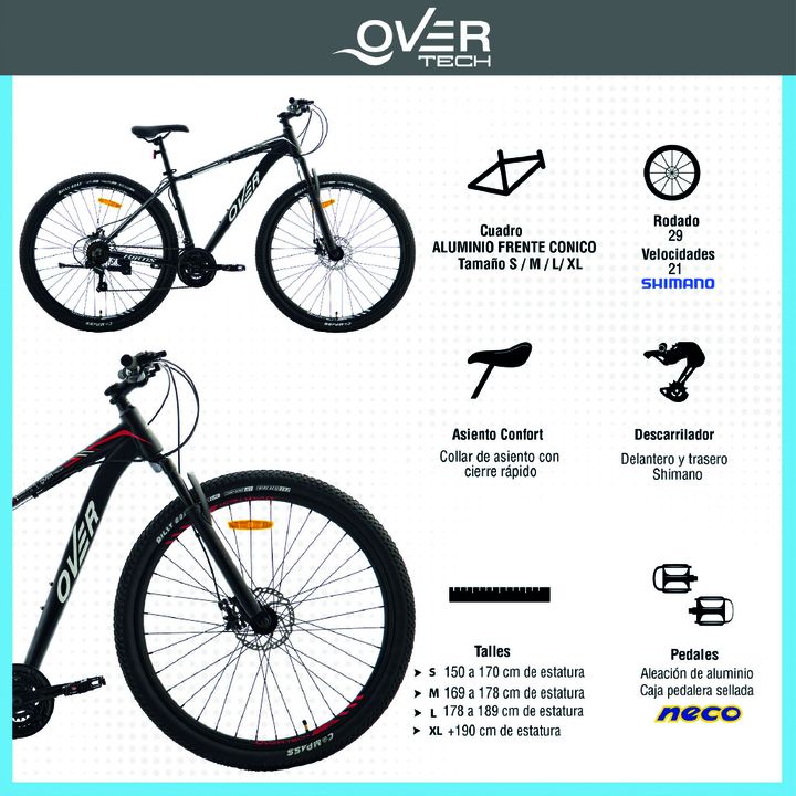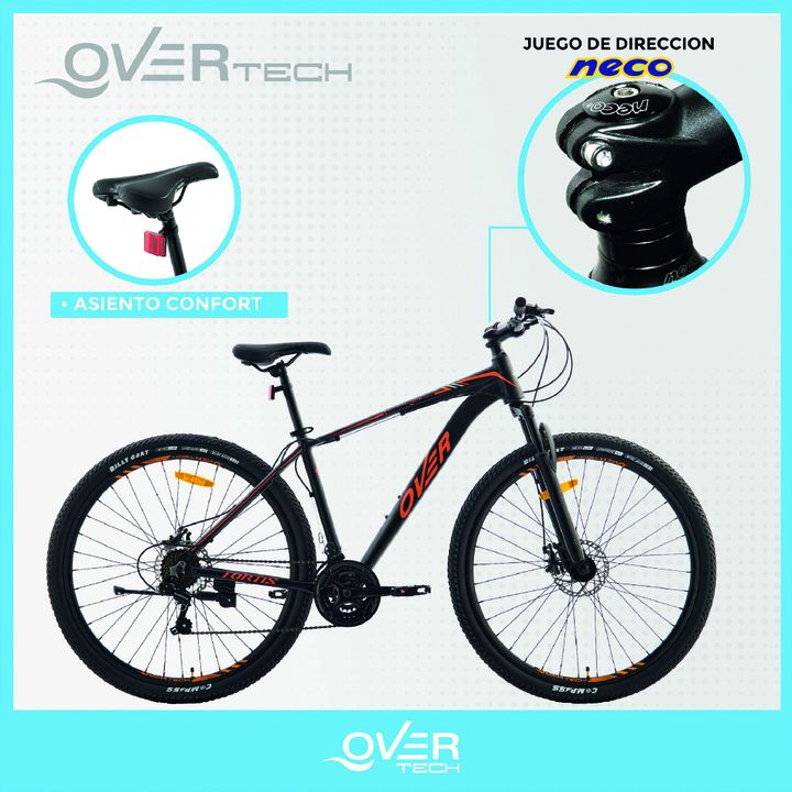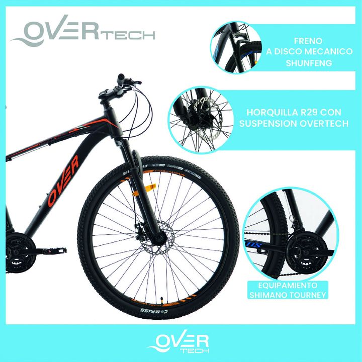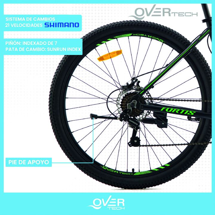 » OVERTECH FORTIS Cuadro: Overtech Fortis Aluminio Frente Conico - Horquilla: Con suspensión R29 - Overtech LIantas: de aluminio doble pared negras, eje de 10 mm STEM: Aluminio 31.8 Juego dirección: NECO H159DM+C2861 Asiento: mtb. negro comfort Cadena: 21v KMC C30 Piñon: SUNRUN 7 SPEED 14T-28T Plato...