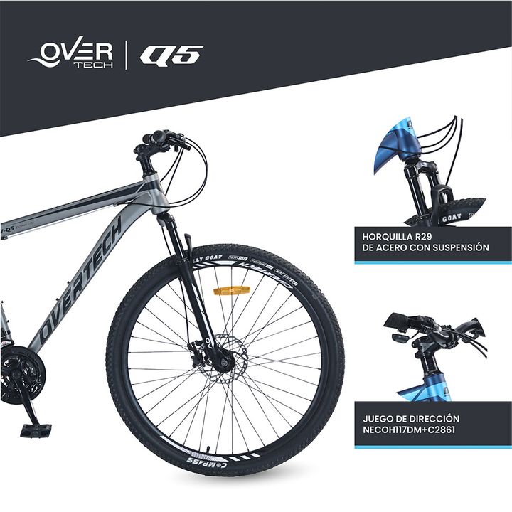 Bicicleta Mtb Overtech Q5, R29 21v Shimano, Freno Disco, Suspensión, Negro/Naranja/Naranja, Talle M