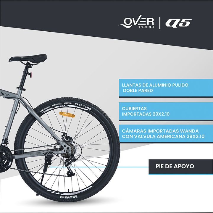 Bicicleta Mtb Overtech Q5 R29 , 21V con Shimano , Freno a Disco, Con suspensión Características principales: Cuadro: Frente cónico, robusto y ligero para mayor durabilidad y control. Horquilla: Suspensión de acero que absorbe impactos, ideal para terrenos accidentados. Mazas: Fabricadas en acero, ga...