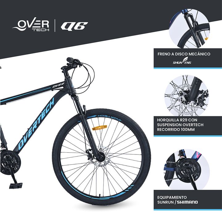 BICICLETA MTB OVERTECH Q6 Descubre la bicicleta perfecta para tus aventuras tanto en la ciudad como en terrenos difíciles. Esta bicicleta de rodado 29 combina diseño moderno y funcionalidad para ofrecerte una experiencia de conducción inigualable. - Cuadro de Aluminio: Ligero y resistente, ideal par...