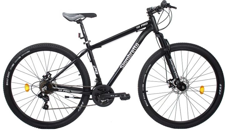 BICICLETA MTB ALUMINIO 10 PRO RODADO 29NEGRO GRIS SIAMBRETTA -Cuadro de aluminio MTB -Talle 20 -Rodado 29 -Transmisión 21V -Frenos a disco mecánico SLP -Piñon 7 coronas a rosca INDEX -Palanca SLP triple acero -Manija cambio + Freno SLP -Cambio TZ-31 SHIMANO TOURNEY -Descarrilador tiro arriba -Horqui...