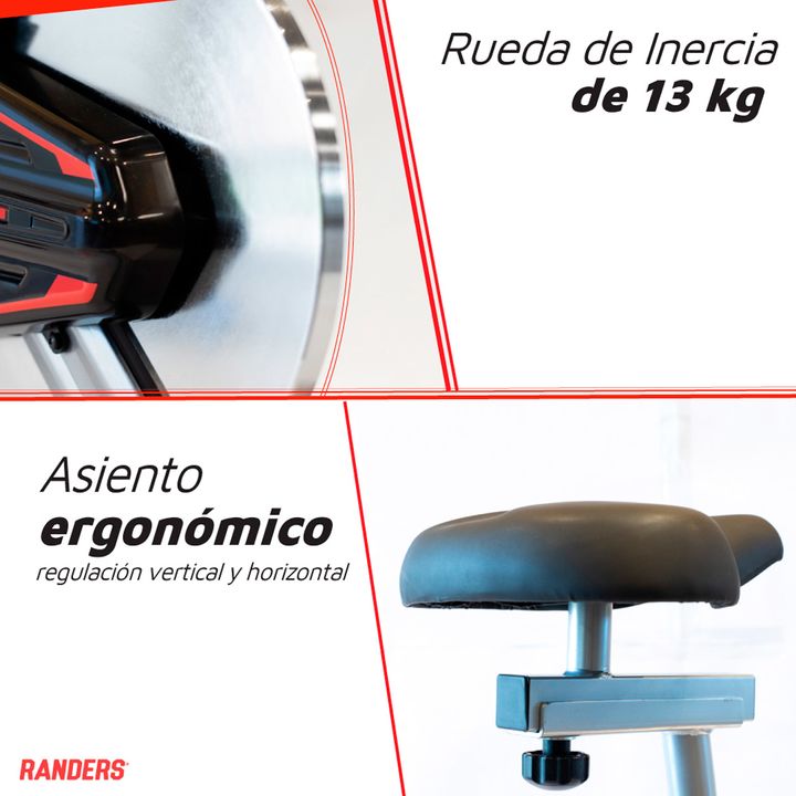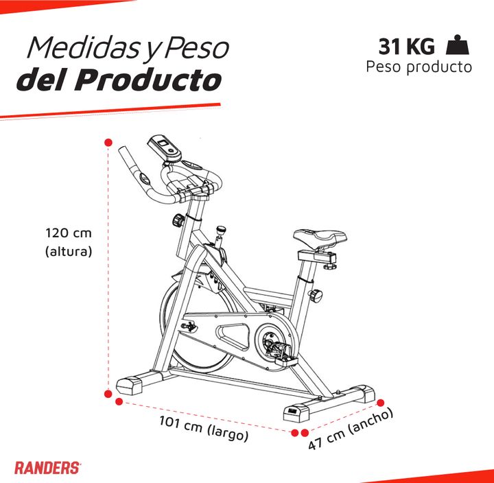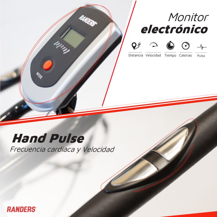 Esta bicicleta cuenta con ruedas para fácil traslado, freno de emergencia y bandas elásticas a los lados del manubrio. CARACTERÍSTICAS: - Marca: Randers - Modelo: ARG-874SP-R - Peso máximo soportado: 120 Kg - Altura máxima de usuario: 195 Kg - Sistema de resistencia: Si - Asiento regulable: Si - Man...