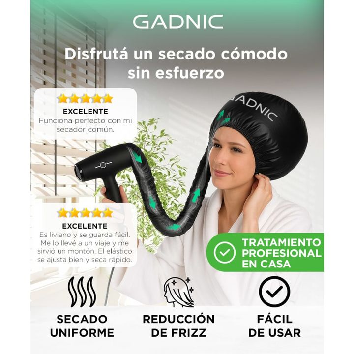 Tratamiento de salón en tu hogar El bonnet convierte tu secador portátil en un sistema profesional para acondicionamiento y secado uniforme. Ajuste firme y cómodo Su banda frontal mantiene el accesorio en su lugar sin incomodidades. Secado más eficiente Reduce hasta 4 veces el tiempo de secado en co...
