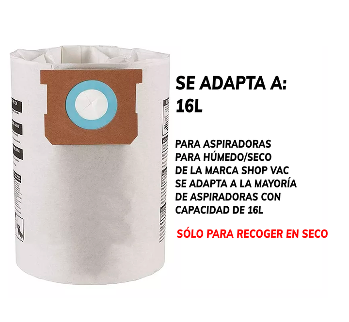 SHOP VAC BOLSA PARA POLVO 4 GALONES/16L 5 UNIDADES/BOLSA SKU: 9056829 El paquete incluye: 5 bolsas de vacío en seco para aspiradoras de 16L Recolección eficaz: la bolsa de filtro de vacío de alta calidad captura la mayoría de partículas pequeñas y polvo de tu taller y casa. Las bolsas desechables ti...
