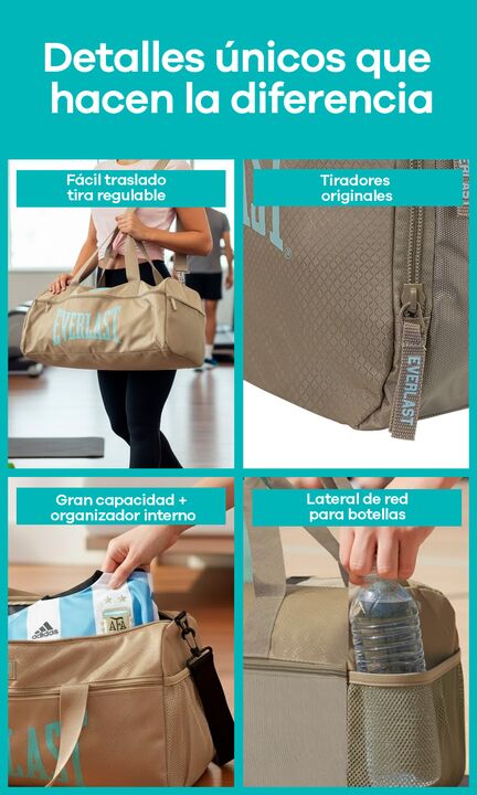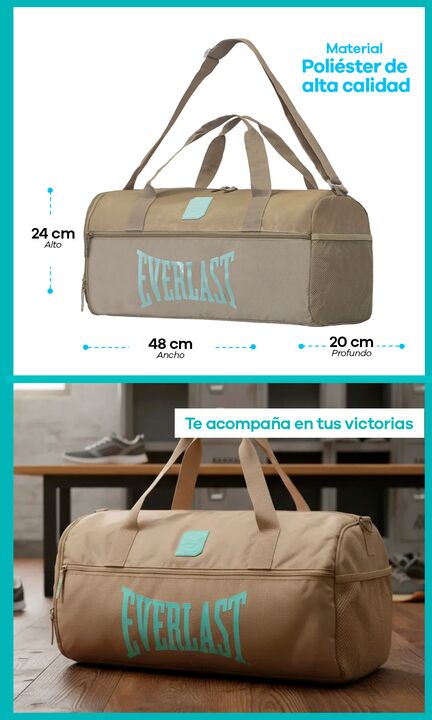 BOLSO DEPORTIVO EVERLAST CON ESPACIO PARA ZAPATILLAS -Material: poliéster de alta calidad, liviano y resistente. -Bolsillo frontal con cierre y llavero Everlast, ideal para lo que necesitas tener a mano. -Botinero independiente en el lateral. -Bolsillo lateral de red porta botellas o accesorios. -In...
