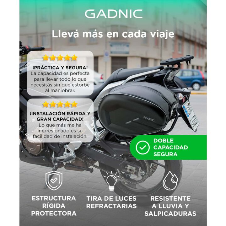 ¡Nuevo bolso doble impermeable para moto! Gadnic presenta el nuevo bolso lateral para moto, impermeable y muy practico Doble espacio de guardado: El bolso lateral para motos posee doble capacidad de guardado, podrás guardar hasta dos cascos o cualquier otro tipo de pertenencia que necesites llevar d...