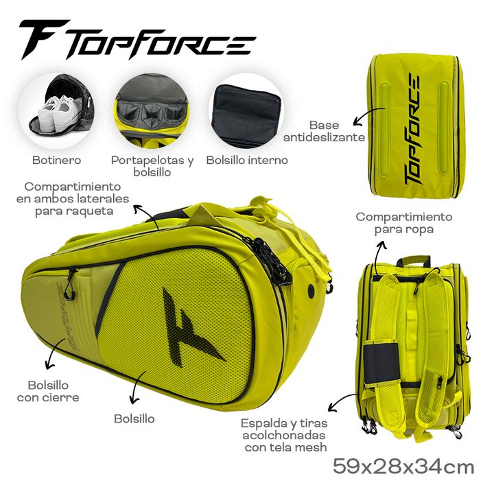 Bolso Padel Mochila Bolsillos Porta Calzado Pelotas y Paletas Top Force Dominá la cancha con el bolso Top Force: diseño premium que organiza todo —paletas, pelotas, calzado y accesorios— gracias a sus múltiples bolsillos, internos y externos, más manijas ergonómicas que hacen el traslado cómodo y rá...