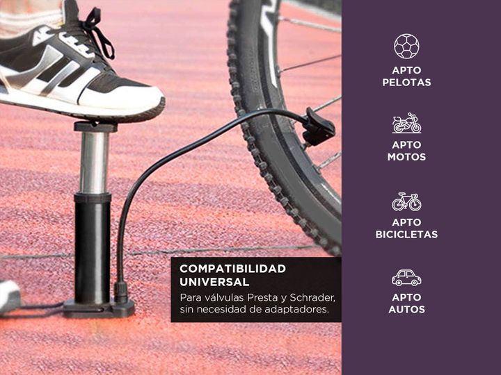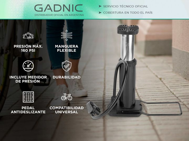 Gadnic presenta la nueva Bomba de pie de alta presión: Presión máxima de 160 PSI: Para inflar todo tipo de neumáticos, incluso de alta presión. Medidor de presión: Permite monitorear con precisión. Compatibilidad: Válvulas Presta y Schrader, sin necesidad de adaptadores. Pedal antideslizante ergonóm...
