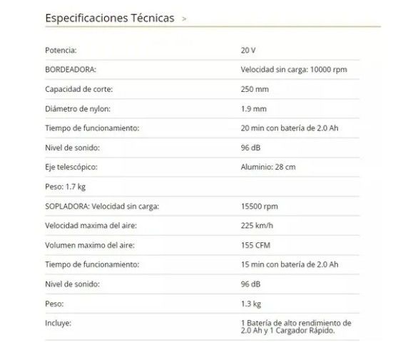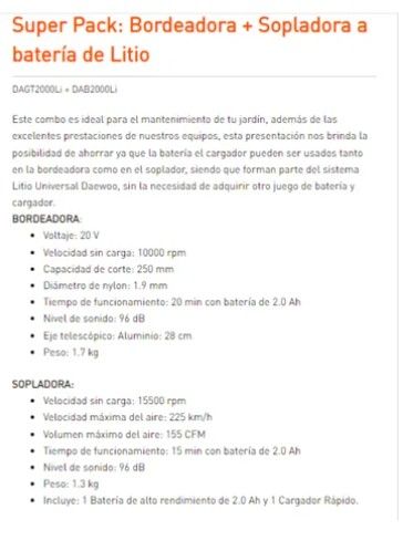 BORDEADORA Y SOPLADORA DAEWOO DAGT+DAB2000LI DAGT2000Li + DAB2000Li Este combo es ideal para el mantenimiento de tu jardín, además de las excelentes prestaciones de nuestros equipos, esta presentación nos brinda la posibilidad de ahorrar ya que la batería el cargador pueden ser usados tanto en la bo...